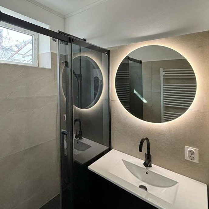 Runde speil passer til alle typer bad. De avrundede formene gir en følelse av større og mer åpent rom. Runde speil fremstår som myke og elegante. Våre LED-speil kan kompletteres med mer enn 15 innovative tilbehør som gir deg en perfekt opplevelse ved bruk. For eksempel kan du legge til en bluetooth-høyttaler og nyte favorittmusikken din når som helst på badet. Blant andre populære tilbehør fra våre kunder finner du klokker, valgfri LED-belysning, berøringskontroll, speilvarme eller glasshylle.