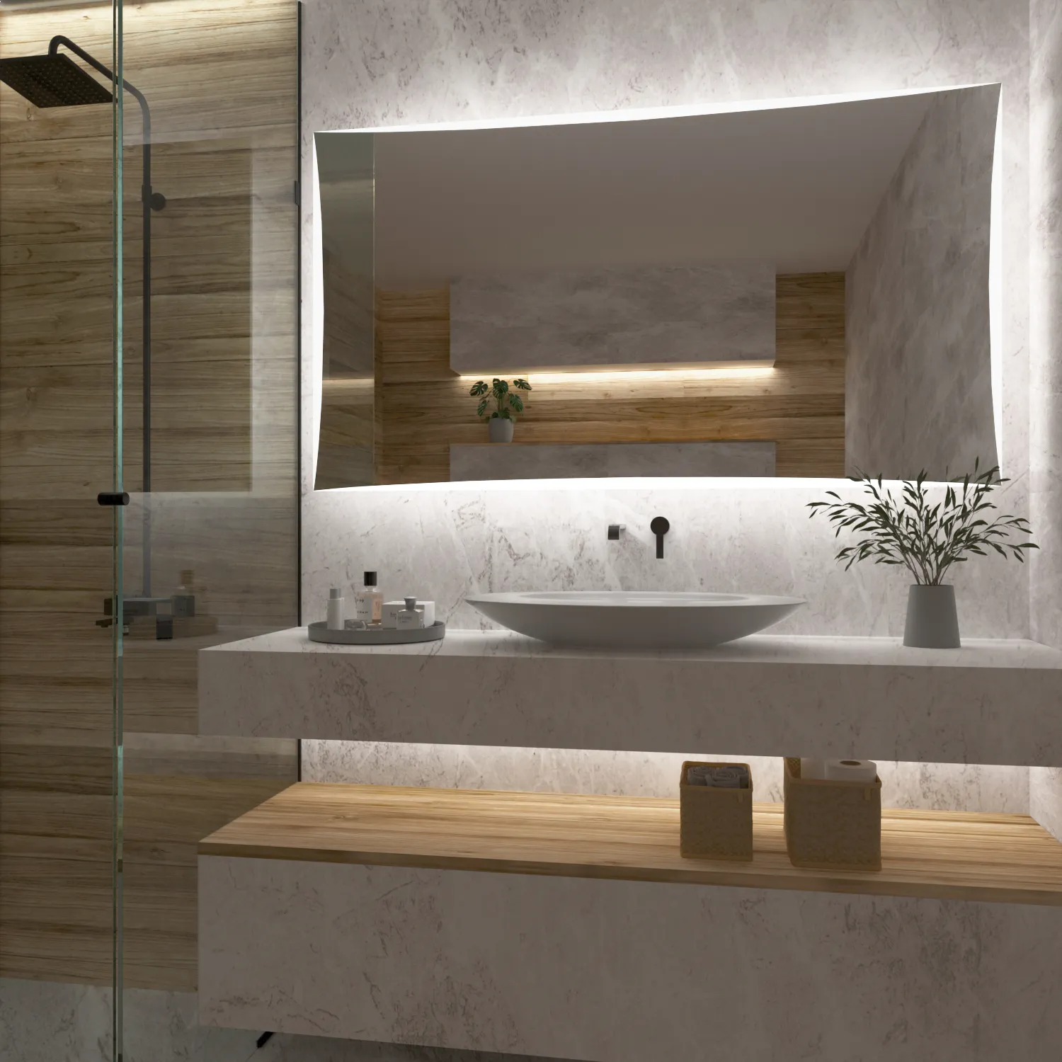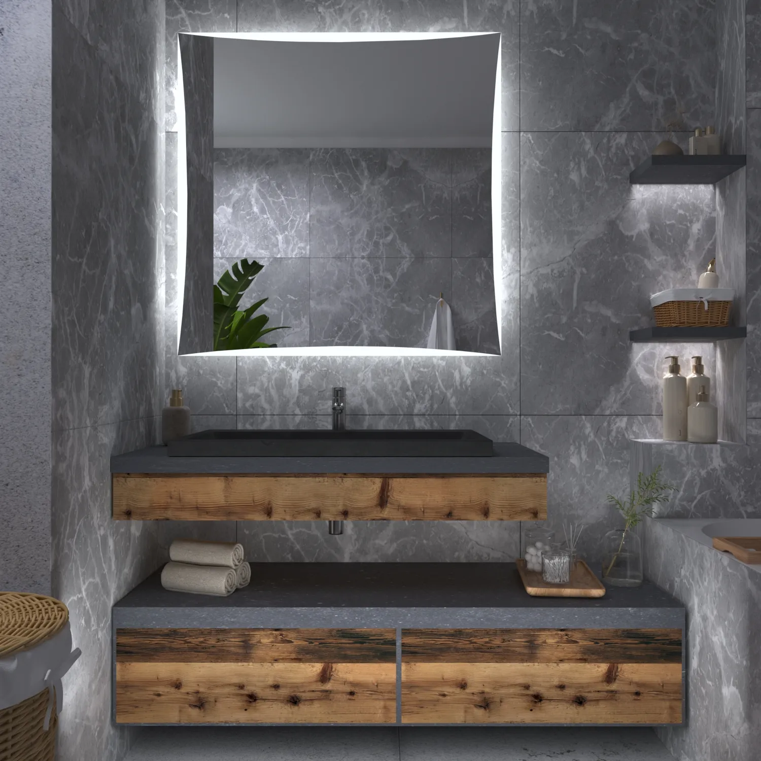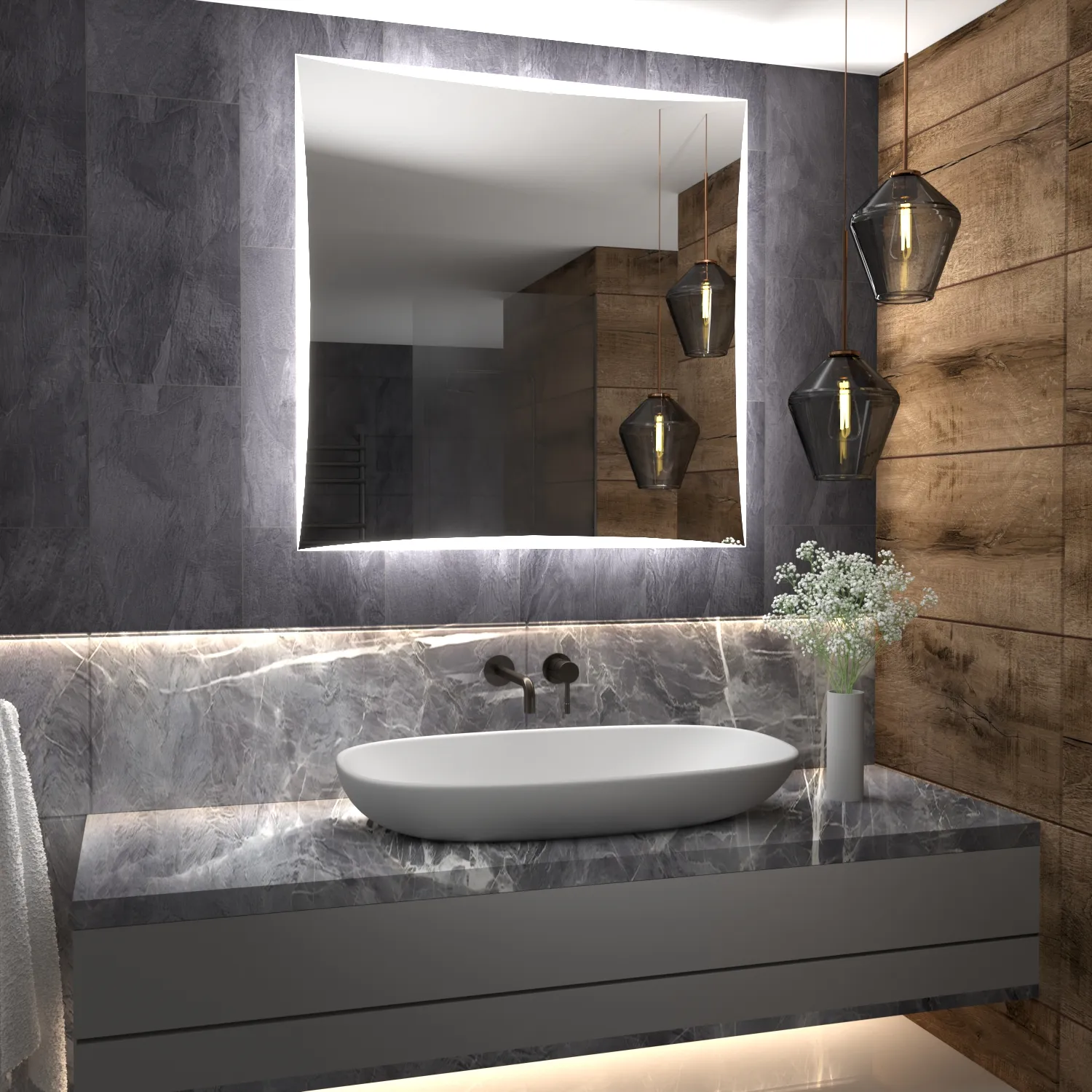 Rektangulære speil skaper en følelse av presisjon, eleganse og modernitet på badet. Deres rette og skarpe linjer bringer struktur og orden til rommet. Rektangulære speil gir ofte et enkelt og minimalistisk uttrykk, som er populært i moderne design. Våre LED-speil kan utstyres med mer enn 15 innovative tilbehør som gir deg en perfekt opplevelse hver gang du bruker speilet. For eksempel kan du legge til en Bluetooth-høyttaler og fordype deg i favorittmusikken din, som du kan spille av på badet når som helst. Blant våre kunders andre populære tilbehør er blant annet: klokker, valgbart LED-lys, berøringskontroll, speiloppvarming eller en glasshylle.