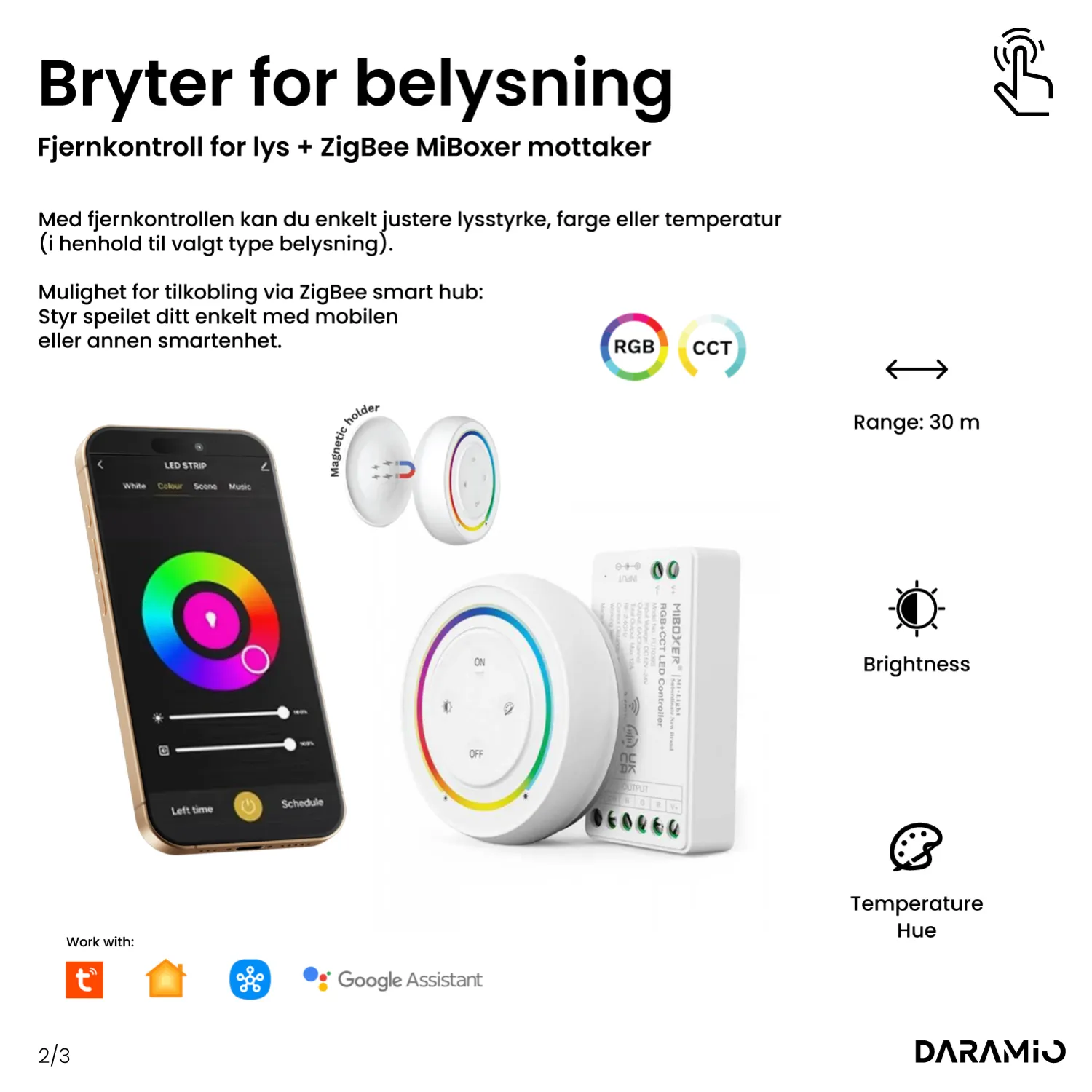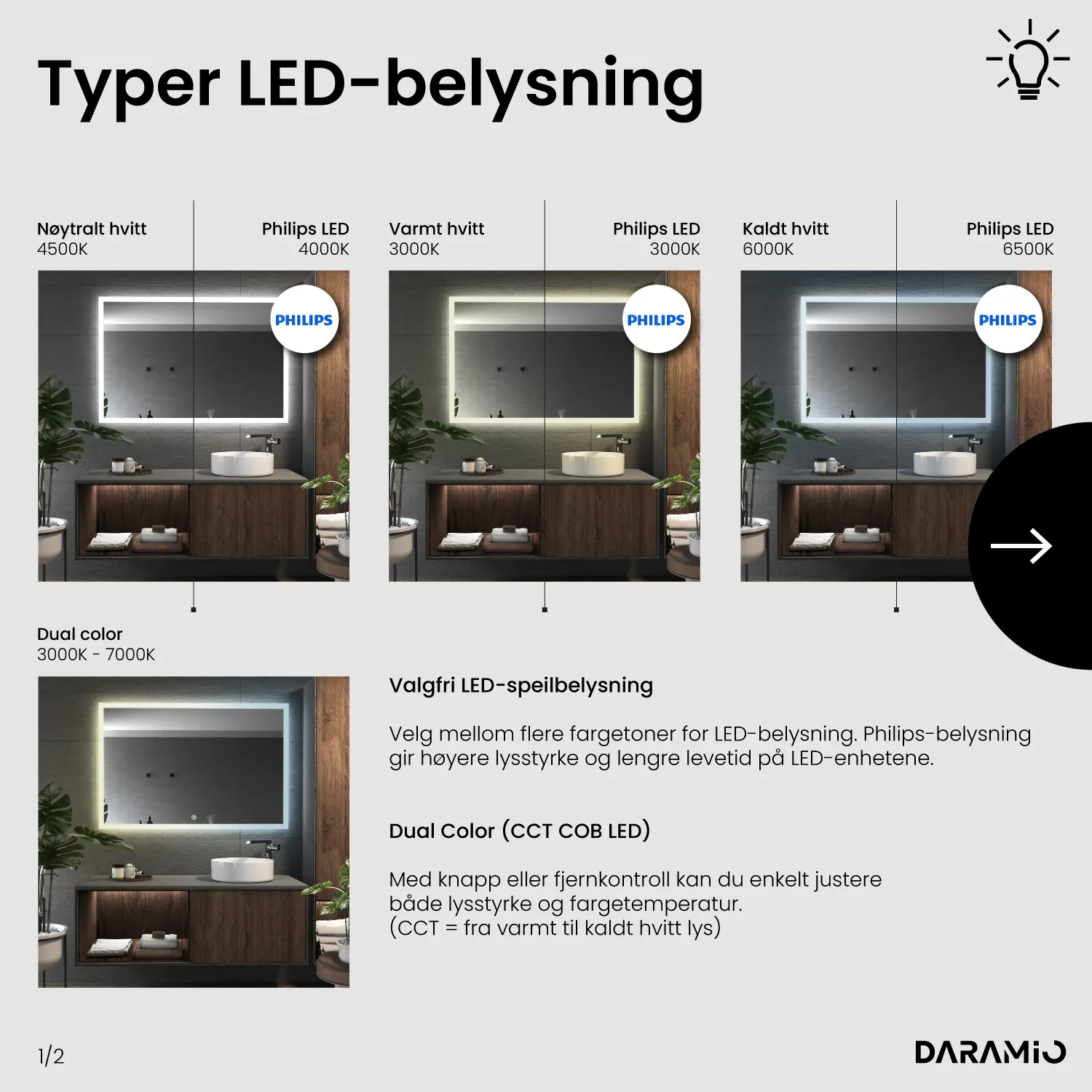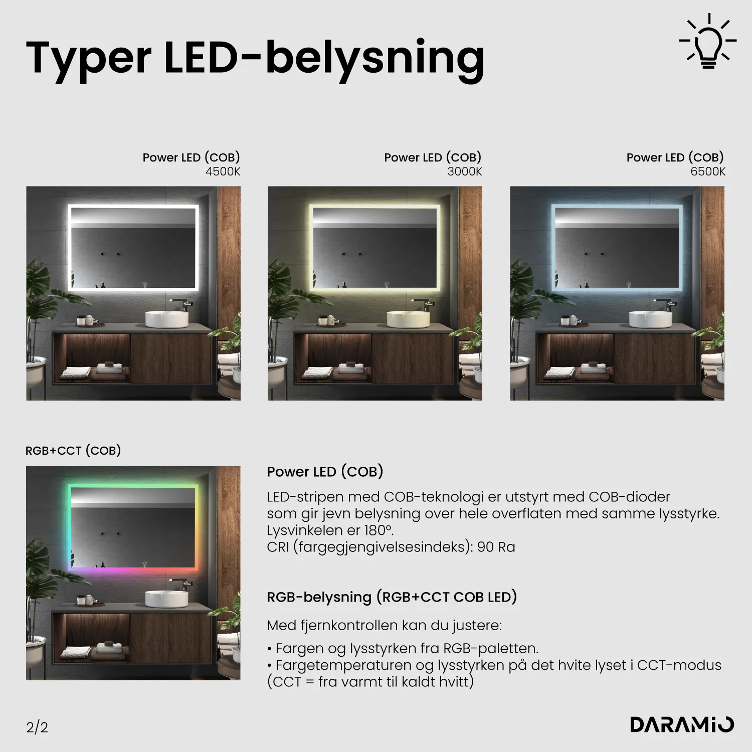LED-farge: Basic LED: 6000K, 4500K, 3000K / Power LED: 6500K, 4500K, 3000K / Philips LED: 6500K, 4000K, 3000K / Dual color: 2700-6500K / RGB+CCT